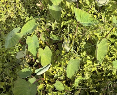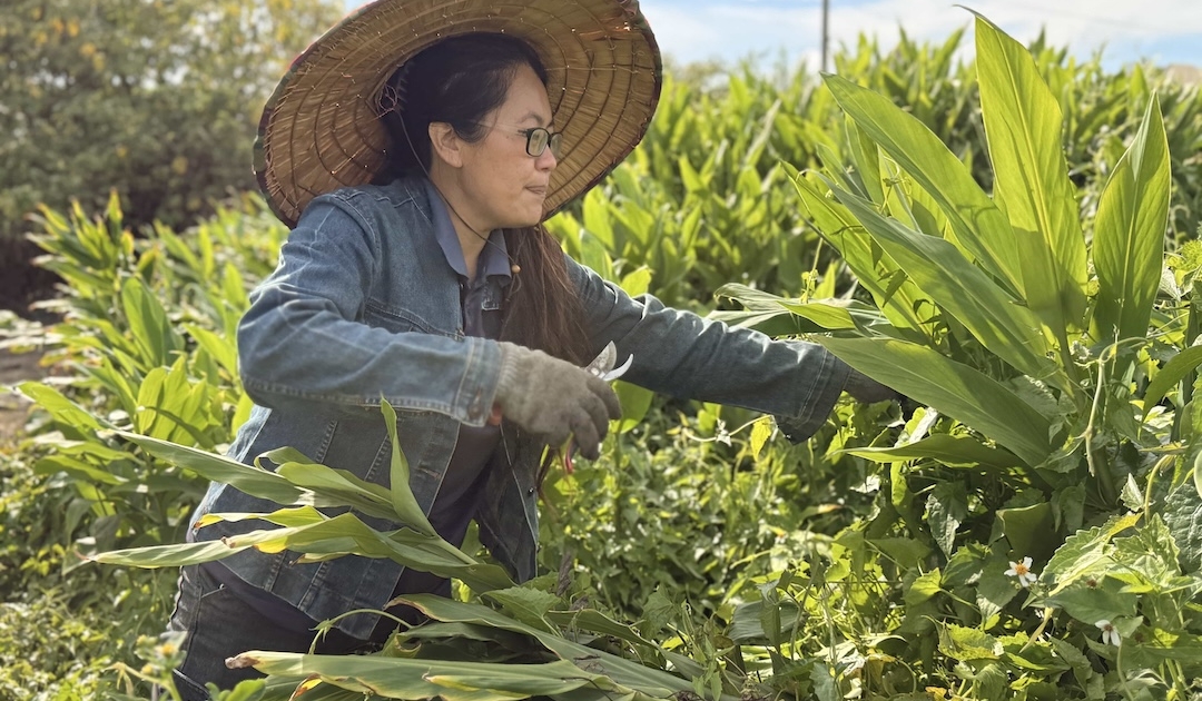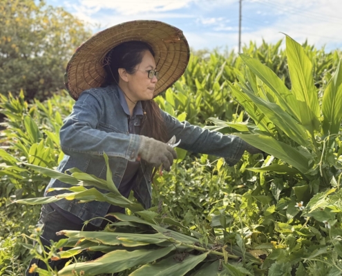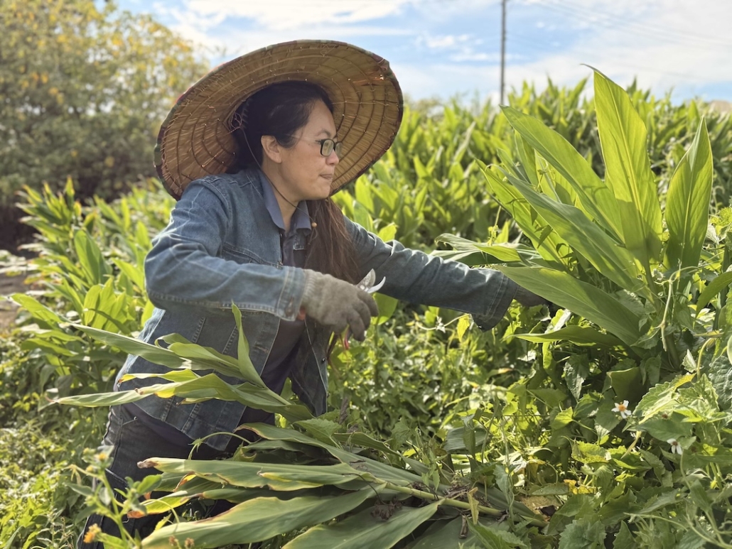 黃宣翡的作物多樣且具有加工潛力,包括青草茶原料、香茅、薄荷、薑黃與野薑花等,甚至還有鳥類帶來的構樹與自然繁衍的野菜。她說:「我種的是我自己想吃、對身體好的東西,也刻意避開市場上大量栽培的作物。」