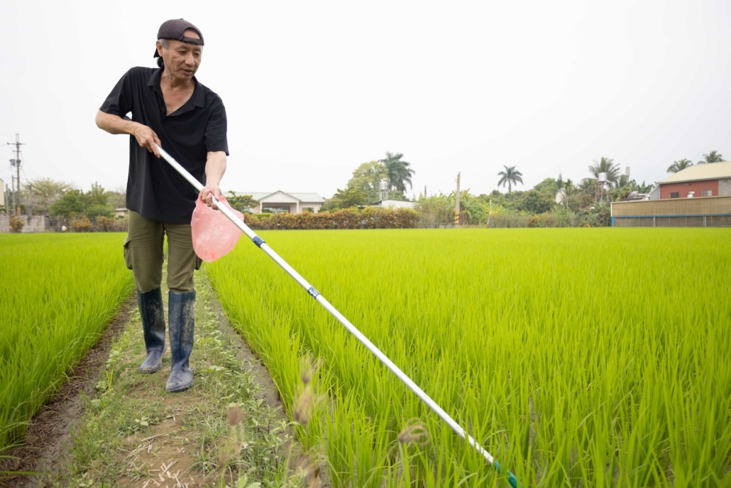 在他的稻田裡,不見除草劑與農藥的身影,取而代之的是自然通風、低密度的種植方式。他說:「我的稻子種得比較稀疏,稻草比較不容易生病,植株也比較強壯,颱風來也不怕。」雖然稻收產量僅為慣行農法的三分之一,甚至四分之一,但他一步步摸索出最適合自己的生產模式。