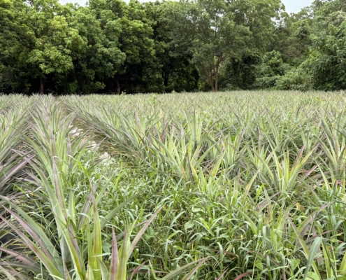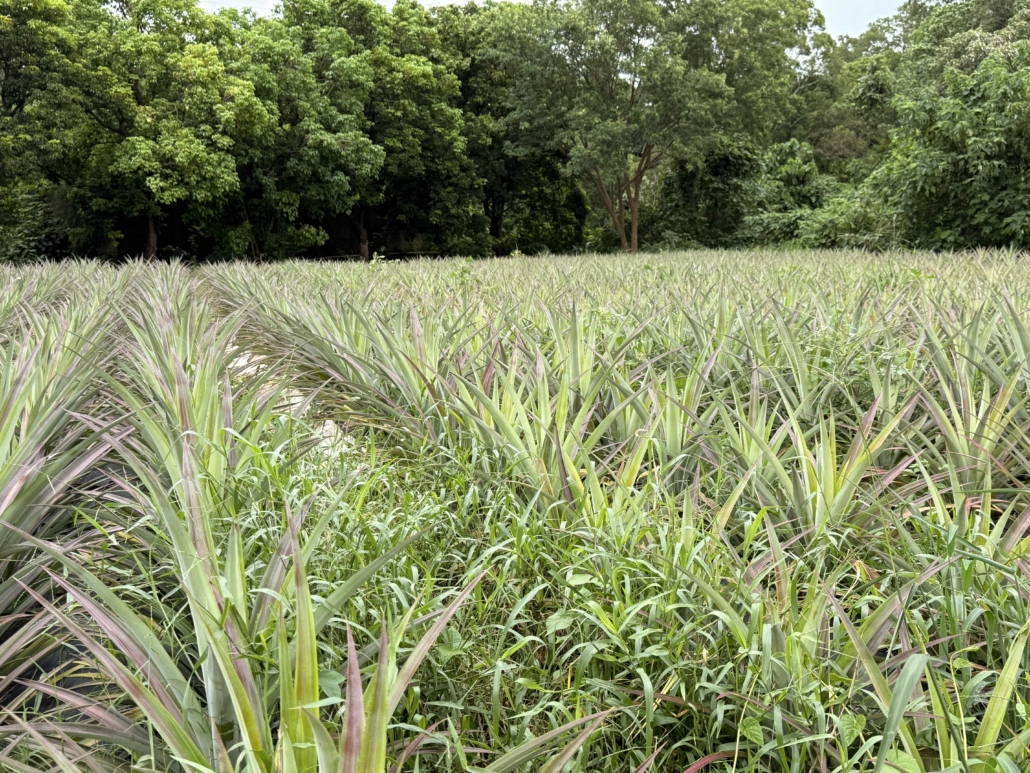 一般我們想像鳳梨田是開闊且遮陰較少的地貌,但這裡的鳳梨卻被樹林所包圍,所以鳳梨個頭偏小,但香氣濃郁、纖維細緻。5甲地中約只有一半種植鳳梨,另一半則是保留下來的森林。「不只是生態緩衝區,也幫助隔離鄰田農藥的污染,更成為猛禽的重要棲地。」宏倫說這來自伯父的構想,而他也延續著伯伯的初衷:不使用除草劑給予自然的有機肥,只以人力割除鳳梨株邊的野莧、大花咸豐草等,保留著樹林底下的地被植物。